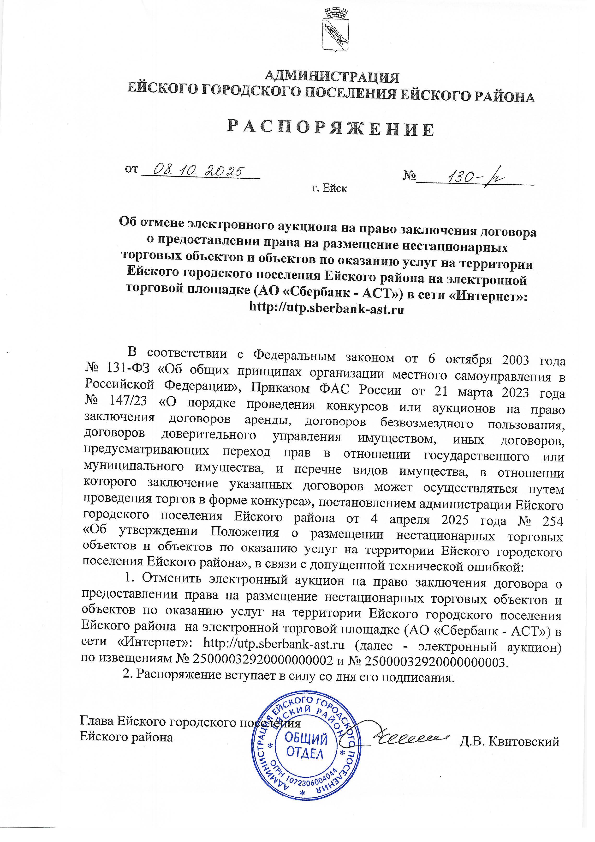Об отмене электронного аукциона на право заключения договора о предоставлении права на размещение нестационарных торговых объектов и объектов по оказанию услуг на территории Ейского городского поселения Ейского района на электронной торговой площадке (АО