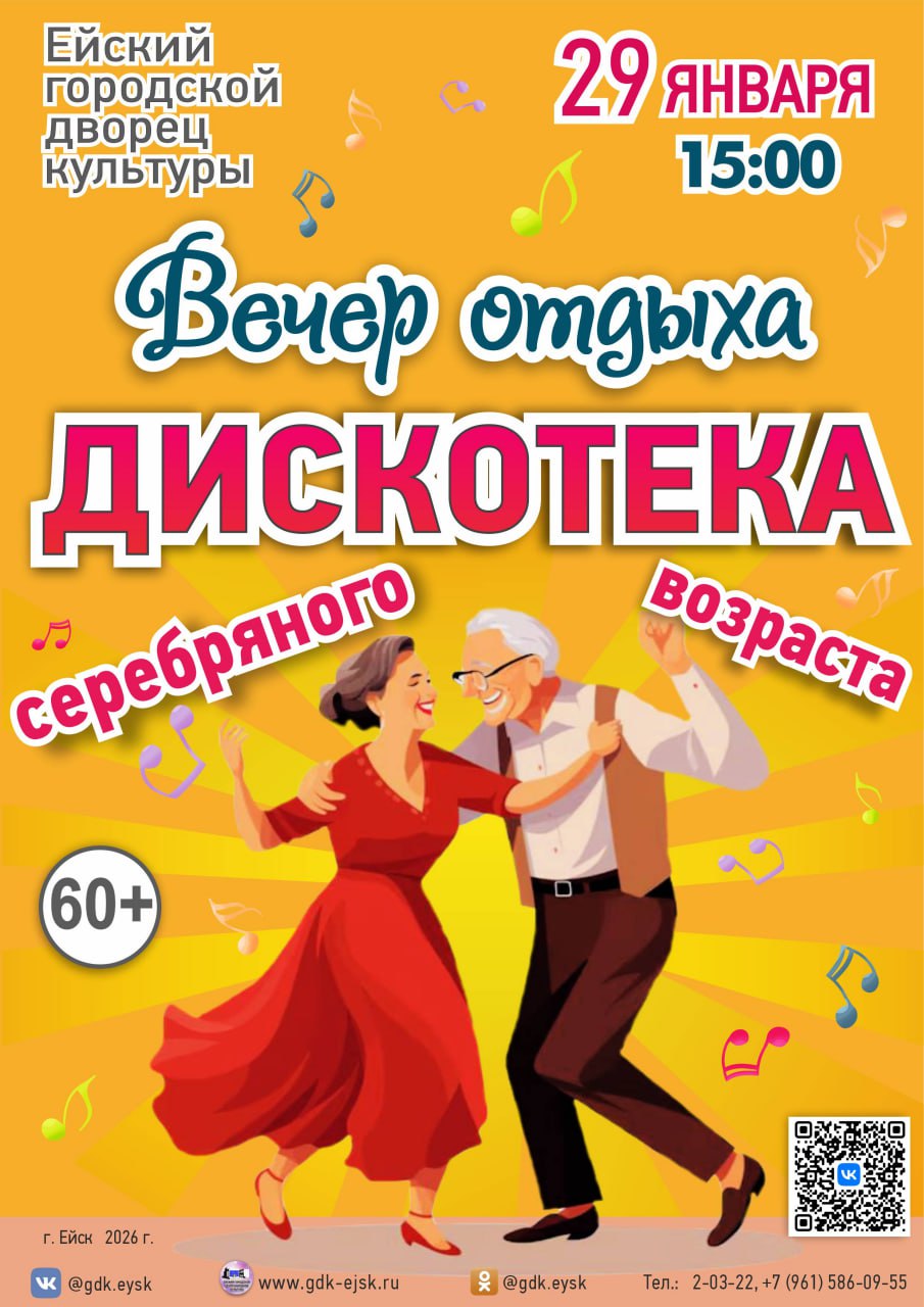 29 января Городской дворец культуры вновь открывает свои двери на вечер отдыха «Дискотека серебряного возраста»! Приглашаем вас окунуться в атмосферу незабываемых хитов, кому близки золотые мелодии и зажигательные ритмы прошлых десятилетий! Наслаждайтесь любимыми композициями в исполнении известных исполнителей, танцуйте и заряжайтесь позитивом вместе с нами!